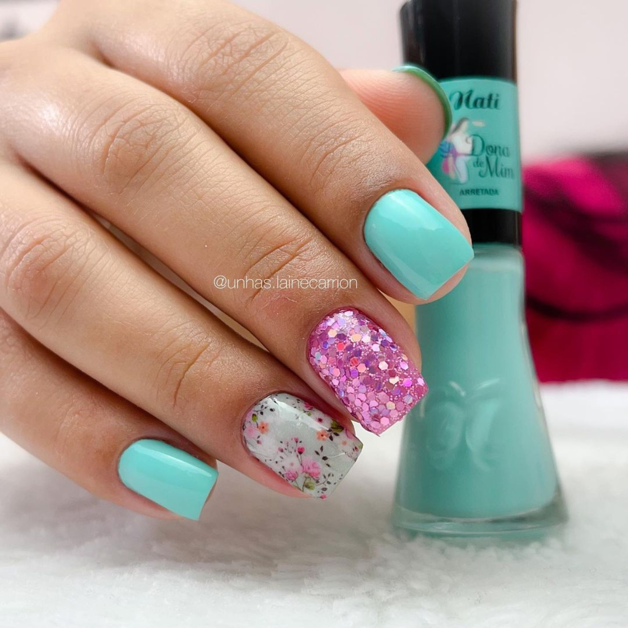 - Esmalte com glitter: perfeito para quem quer dar um toque de glamour à decoração das unhas, o esmalte com glitter pode ser usado tanto em toda a unha como em detalhes específicos.