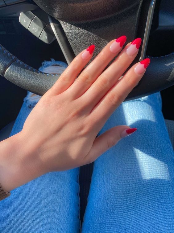 O esmalte vermelho é uma escolha clássica para repetir essa nail art, e os resultados são incríveis! Por exemplo, vale incrementar o visual com brilho discreto. Ou invista em diferentes tons de vermelho, como este elegante bordô.