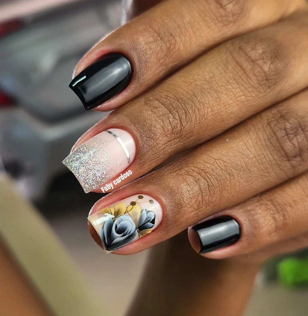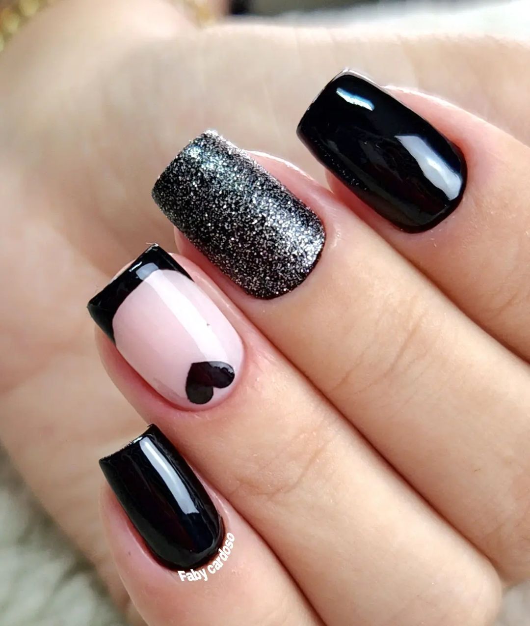 Design simples de unhas decorativas pretas para você que não quer algo mais complicado, mas bonito e inspirador. Este pequeno desenho de unha fica ainda melhor, tomando a forma de francesinhos com tons de preto fosco ao fundo e francesinas com tons de preto cremoso. Para fazer a diferença nos tons mais escuros do esmalte, você pode adicionar brilho e ficar glamourosa.