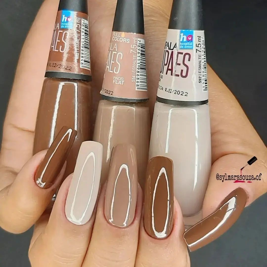 - Gradiente Marrom: O efeito gradiente é uma maneira estilosa de usar esmaltes marrom. Escolha tons de marrom que variam de claro a escuro e crie uma transição suave de cores nas suas unhas. Essa técnica adiciona profundidade e dimensão ao seu visual, deixando suas unhas elegantes e estilosas.