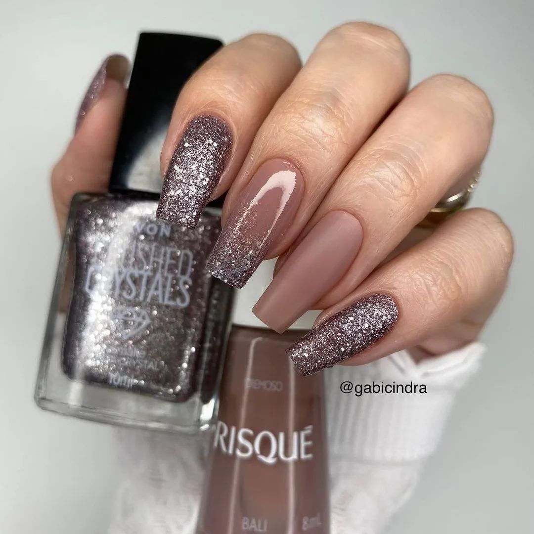 - Detalhes em Brilho Marrom: Adicione um toque de brilho ao seu esmalte marrom com detalhes em glitter ou esmalte cintilante. Pinte suas unhas com esmalte marrom e adicione glitter na ponta, nas laterais ou em pequenos pontos ao longo das unhas. Isso cria um visual elegante e brilhante, perfeito para ocasiões especiais.