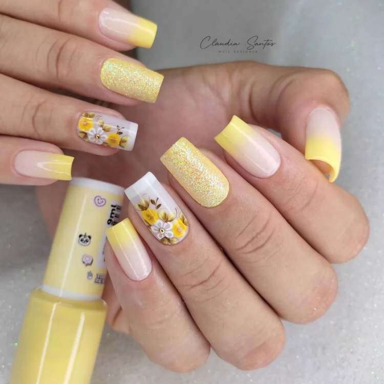 - Adicione um toque de brilho aos seus adesivos de flores com um esmalte de glitter ou um top coat com brilho.