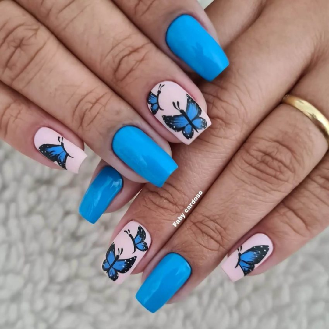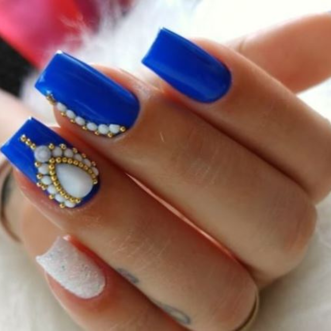 - Unhas Azul Metálico: Para um visual mais ousado e moderno, o esmalte azul metálico é uma excelente escolha. Esse acabamento brilhante e luminoso adiciona um toque de glamour às suas unhas. Você pode optar por um esmalte azul metálico sólido ou incorporá-lo em designs mais elaborados, como nail art geométrica ou estampas abstratas.