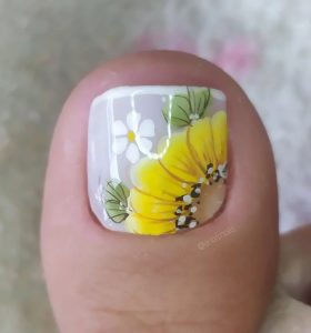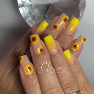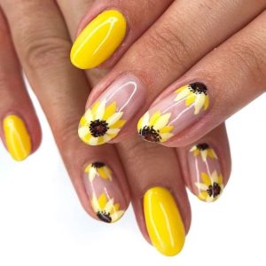 Unhas de girassol divertidas e vibrantes. O amarelo, a cor mais usada na decoração, ajuda a unha a manter a forma e atrair a atenção das pessoas. A decoração floral surgiu pela primeira vez e com o avanço da tecnologia foi mudando gradativamente e hoje todos os tipos de flores podem ser encontrados na decoração de unhas.