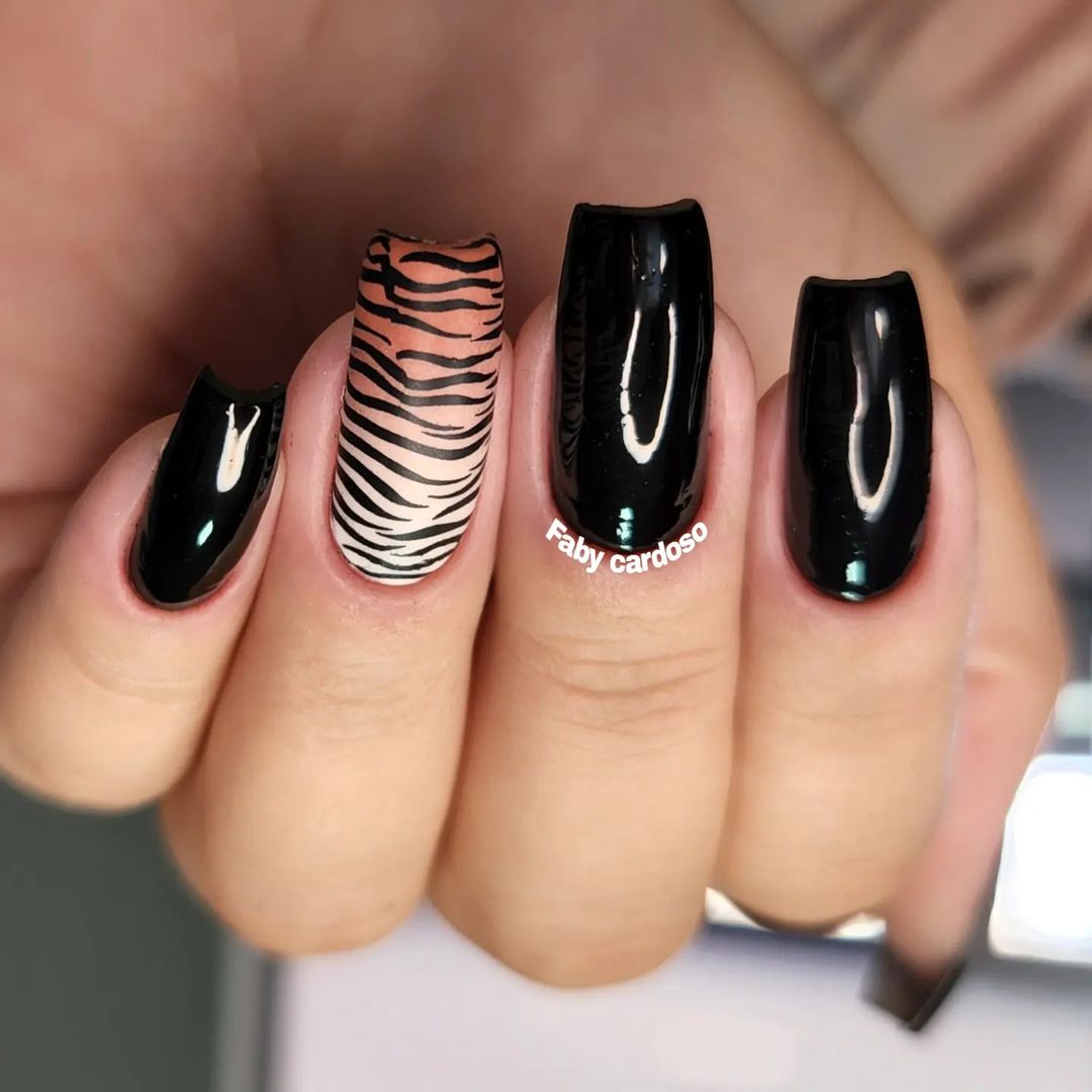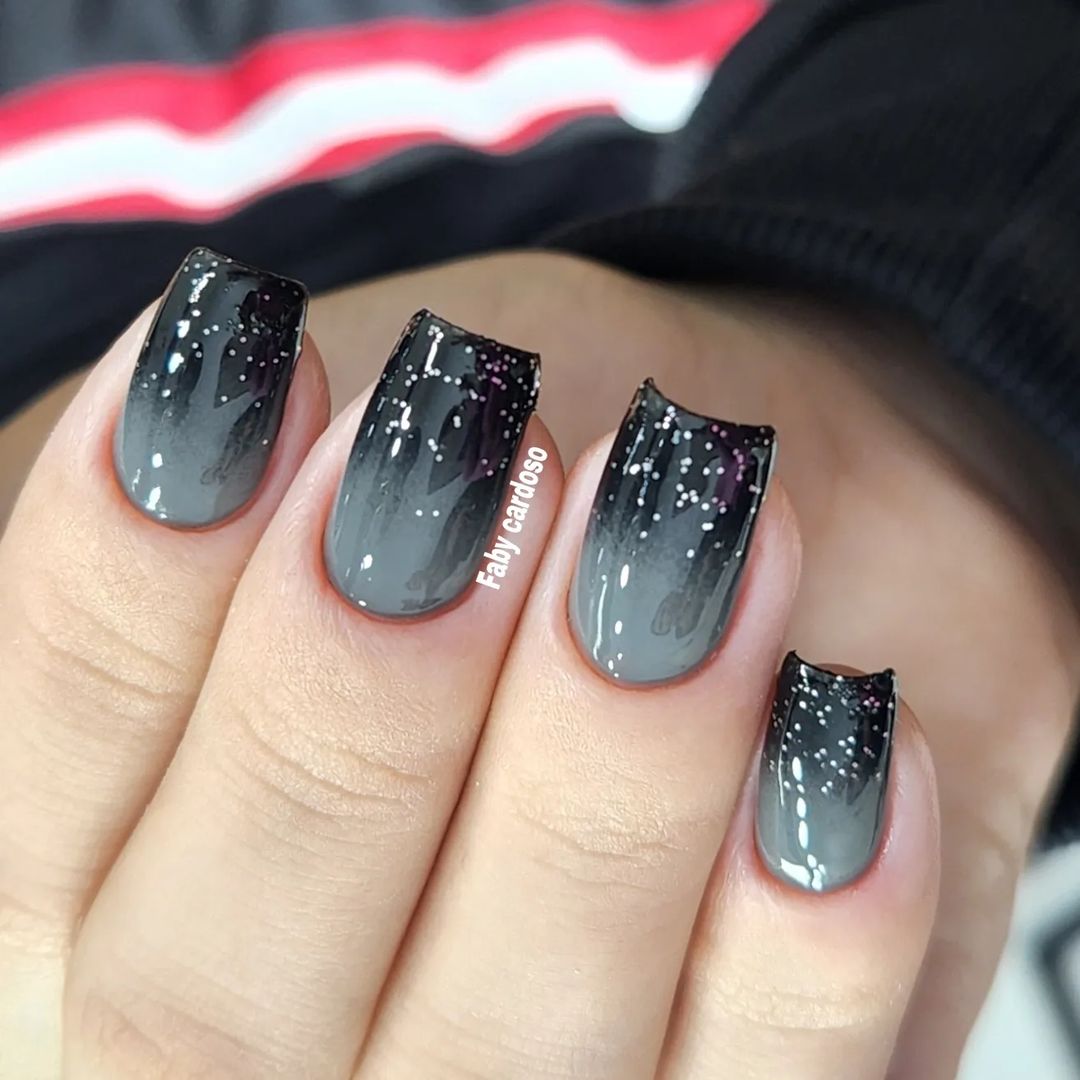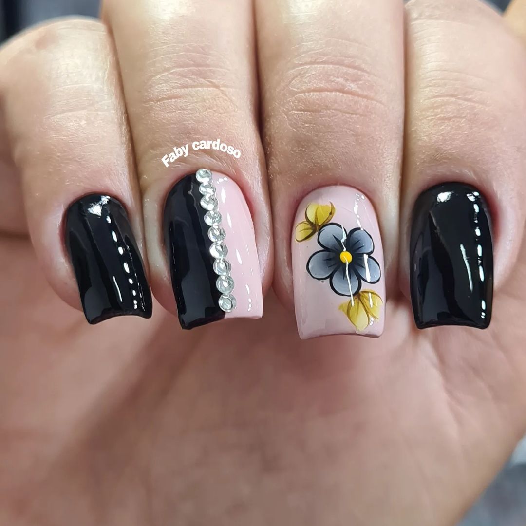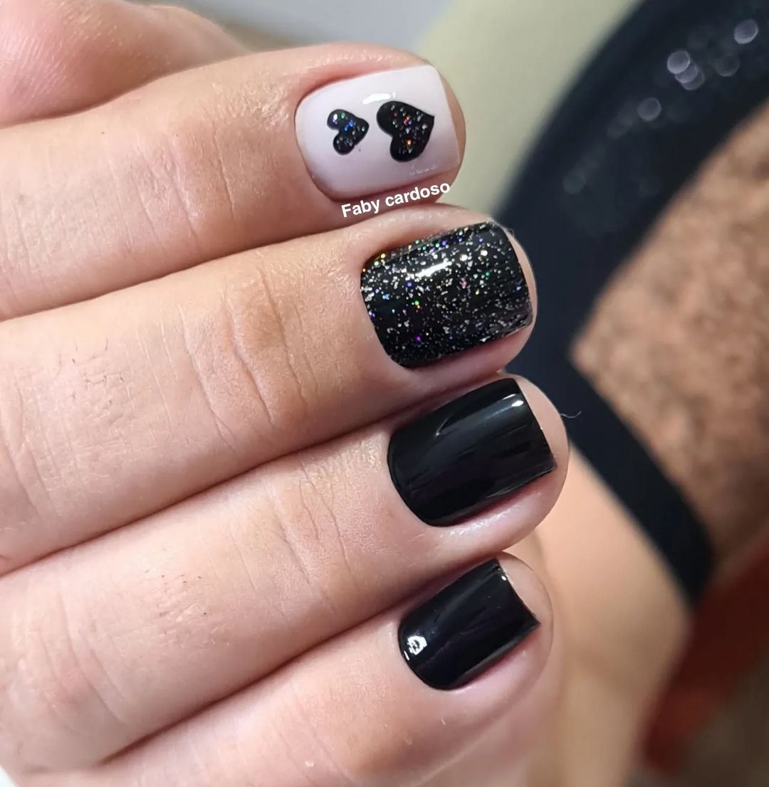 No entanto, se o objetivo é brilhar mais do que qualquer outra coisa, as unhas pretas com glitter são a melhor escolha. Brilhe nos olhos e brilhe na ponta dos dedos. O esmalte preto combina bem com detalhes em glitter. Então, se você não se importa em arriscar, aposte nessa combinação marcante.